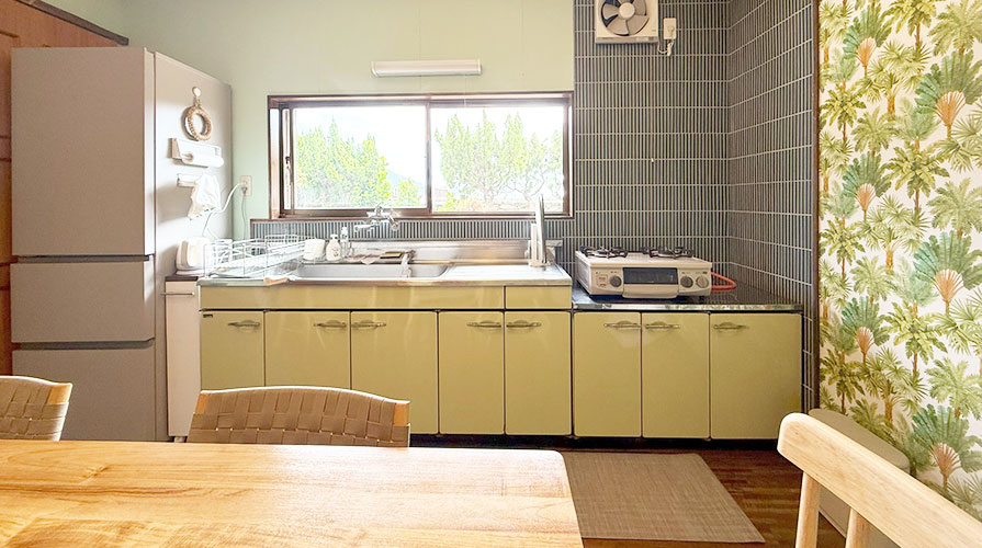 洗濯機・乾燥機やウォシュレット付きの清潔な水回り。キッチンにはレンジ、トースター、コーヒーメーカー、炊飯器、大型冷蔵庫など調理器具が充実。島の食材を使ってお料理も楽しめます。